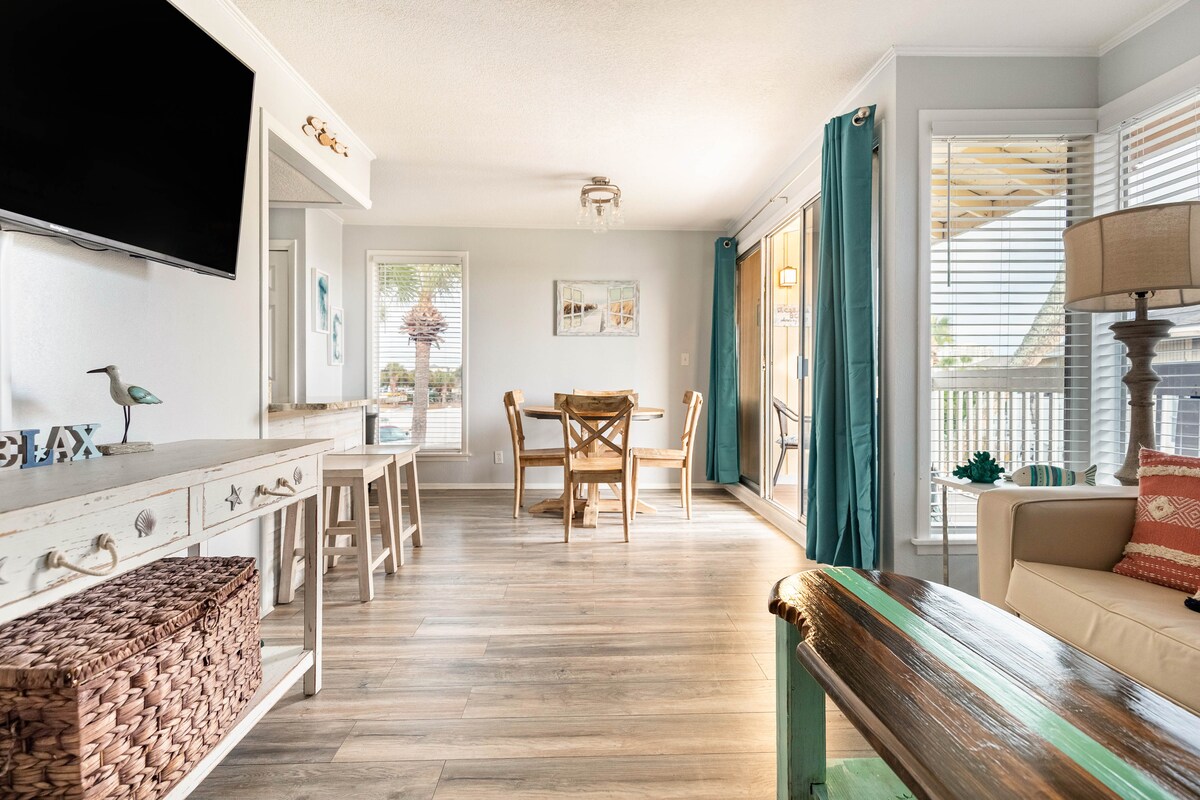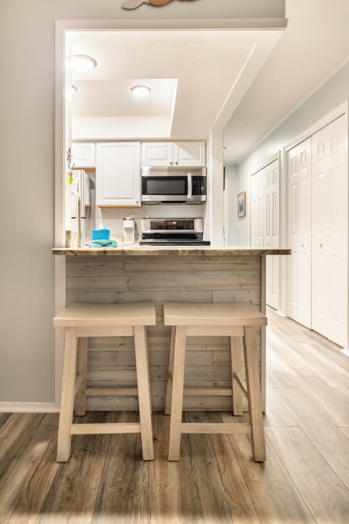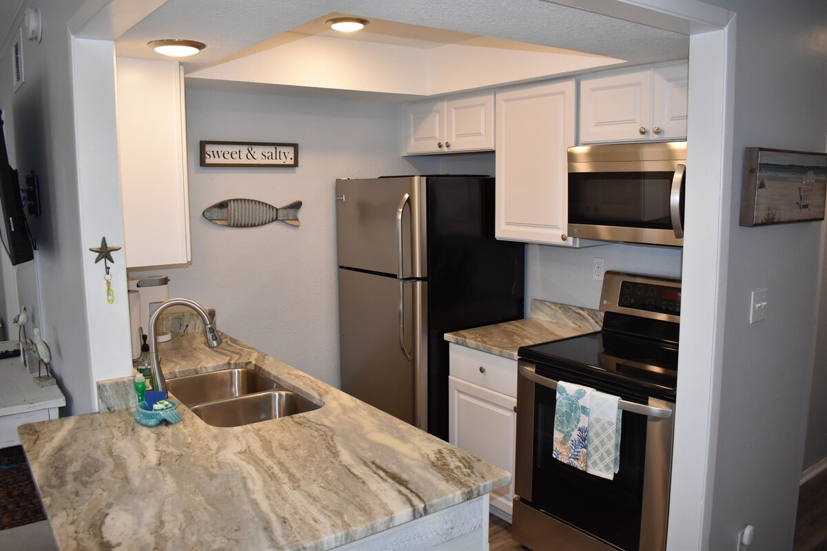 DestinThis updated, adorable condo is the perfect place for a relaxing vacation. Sit out on the spacious balcony overlooking one of the 9 Par-3 golf holes while drinking your morning coffee and breathing in the fresh salt air. Cook up your catch of the day in the fully equipped kitchen, then relax in the spacious living room and enjoy a movie with the family on the 55” Roku tv before a restful night on the king-sized Nectar memory foam mattress.